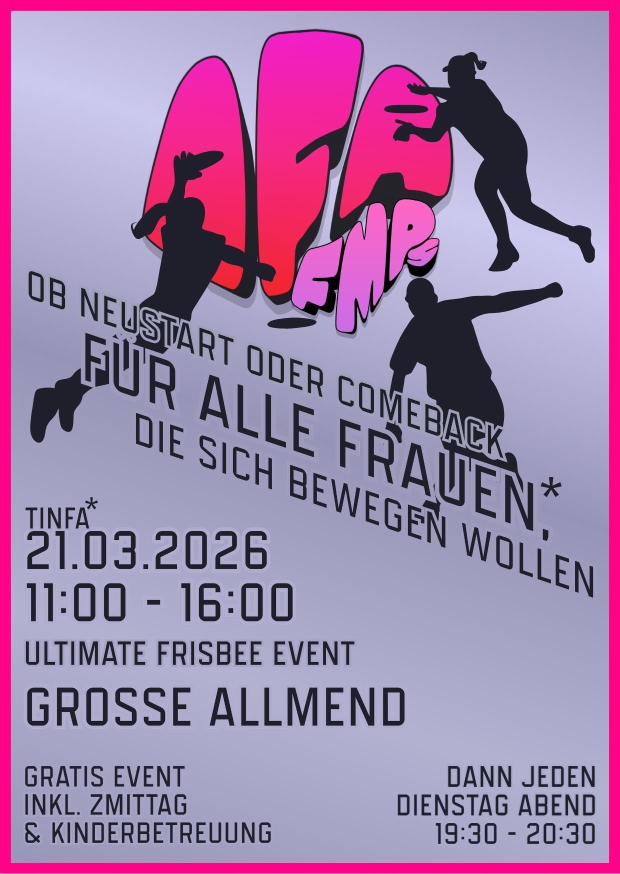 Dieser Event richtet sich an alle Frauen & TINFA, die Ultimate Frisbee kennenlernen, wieder einsteigen oder einfach einmal ausprobieren möchten. Egal ob du schon einmal gespielt hast oder zum ersten Mal eine Scheibe in der Hand hältst. Alle Levels sind willkommen!